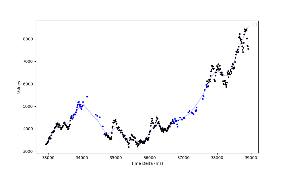 During the local test, I had a client send messages every 5ms and had the server reject messages for 1s intervals every 3s. Observations in black were collected in-order as part of the normal operating periods, the blue observations (notice that these periods are sparser!) represent values that are backfilled from the buffer after the βoutagesβ have cleared.