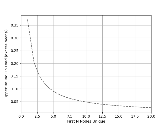 In a previous post I discussed the maximum gap of draws from . There is a clear application of this problem to load balancing across many nodes. Given a dataset () of keys randomly hashed to one of nodes, we can expect that no node is responsible for more than keys. However, requests are not distributed equally across keys. A node storing a few popular keys may have much higher load than a node storing hundreds of less frequently accessed keys. Today we’ll calculate a bound for max load () assuming keys an arbitrary distribution over and that keys are assigned to nodes at random with a hash function, .
