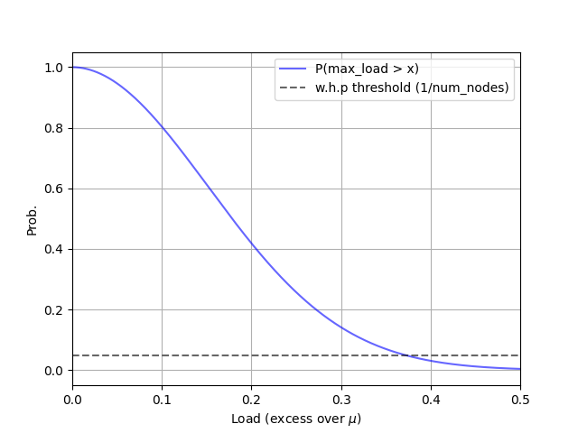This approach might be viable given a distribution with faster decaying tails, but in this case it produced a variance too high to be of any use. In general, methods that try to find by bounding the load on a fixed number of keys also consider the event that other nodes with fewer keys exceed that bound as well. This gets dodgy very quickly, I want no parts of it.