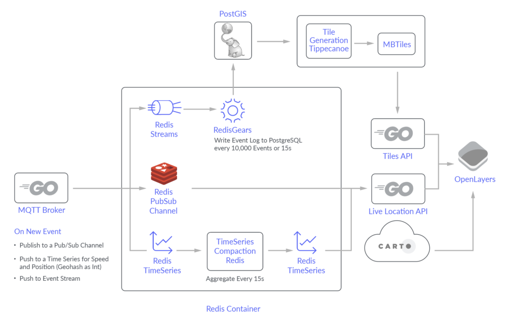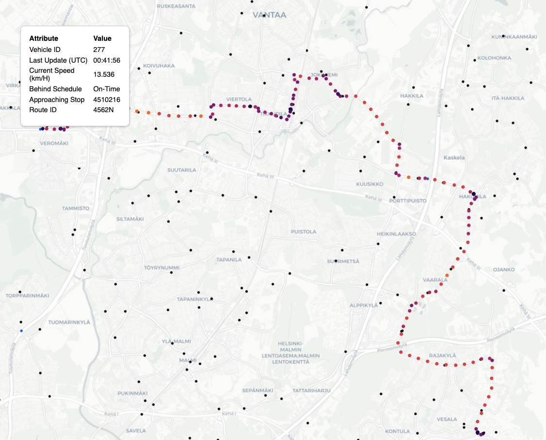 This project publishes realtime locations of municipal transport vehicles in the Helsinki metro area to a web UI. Although Helsinki offers a great realtime API for developers, there is no site that makes this data generally available to the public. Given that HSL publishes on the order of ~50 million updates per day, I felt that Redis TimeSeries could be a great tool to to quickly aggregate tens of thousands of points. Data is sourced from the Helsinki Regional Transit Authority via a public MQTT feed. Incoming MQTT messages are processed through a custom MQTT broker that pushes them to Redis. More about the real-time positioning data from the HSL Metro can be found here.