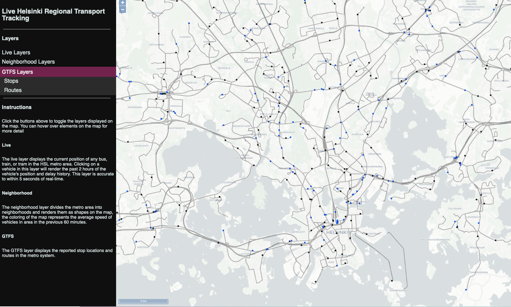 โ UI with GTFS (black) and vehichle (blue) layers enabled.